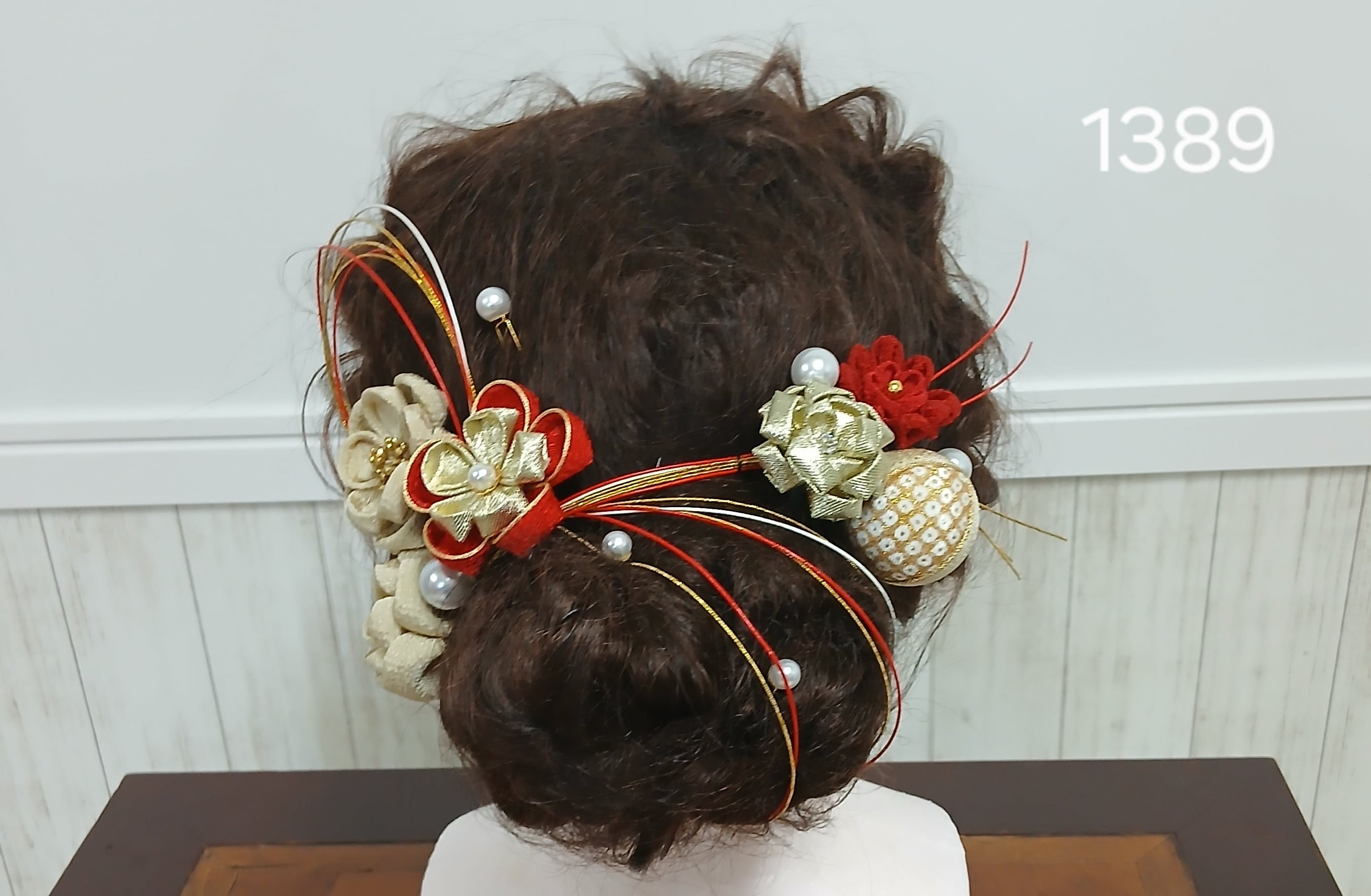 髪飾りNo.1389は、特別なお祝いの場にぴったりな、格好いい髪飾りです。赤と金、ベージュのつまみ細工が巧みに組み合わされ、存在感のある華やかさが際立つデザインとなっております。この髪飾りは、洗練された印象を与えながらも、あなたのスタイルを一層引き立てることでしょう。