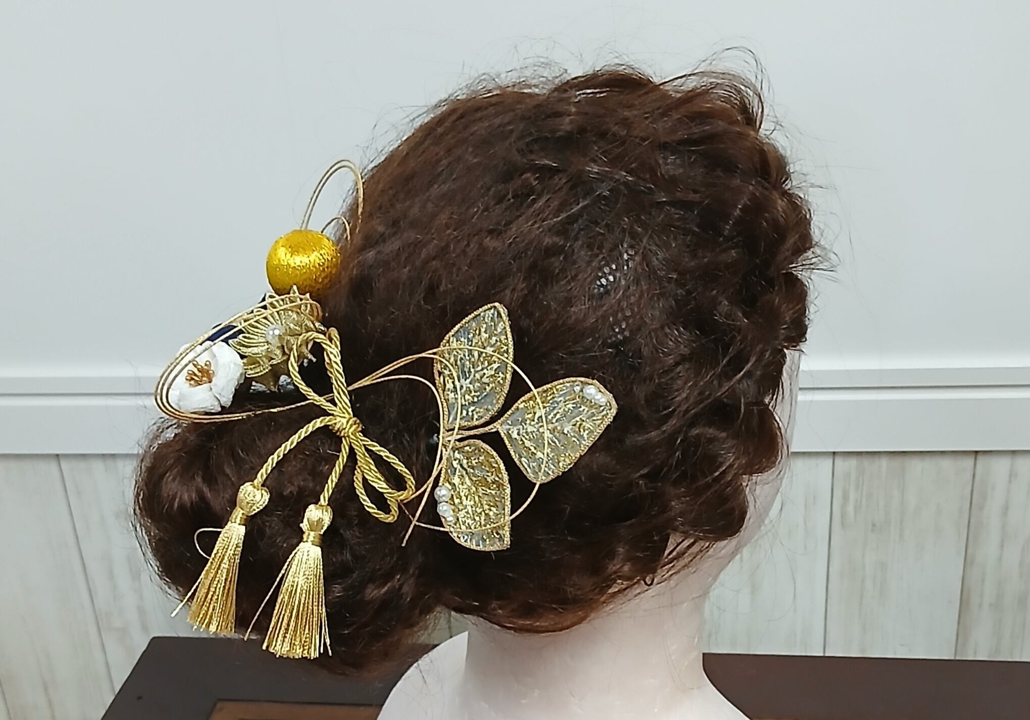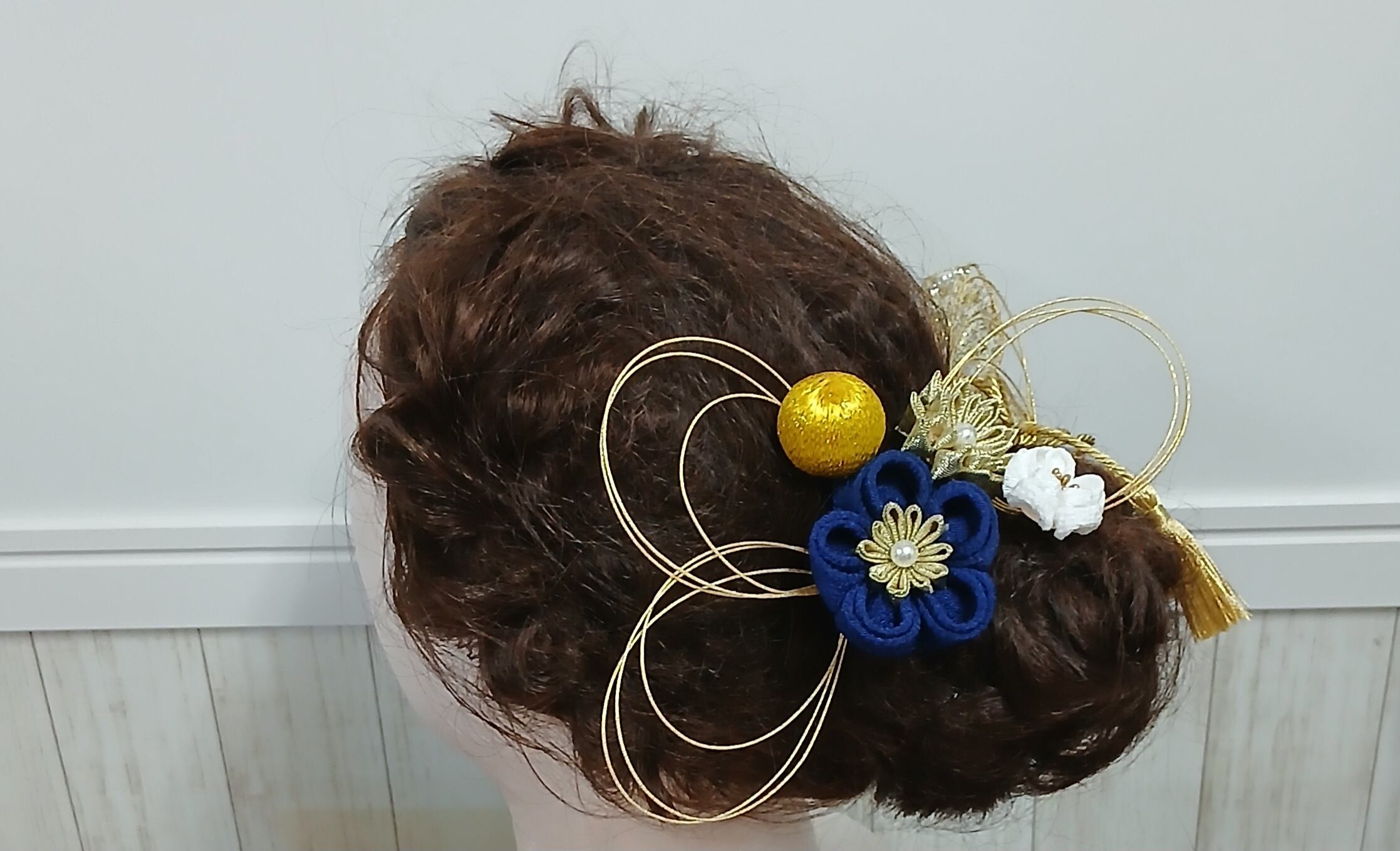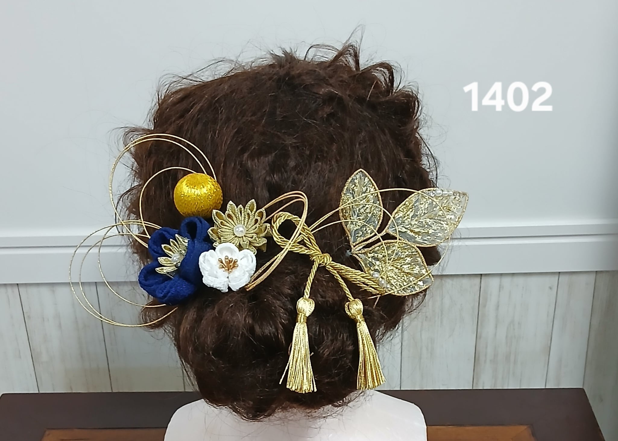 No.1402は、上品で華やかな魅力を持つ髪飾りです。金色の水引と、紺と金、白のつまみ細工が巧みに組み合わさり、パールやスワロのリーフがその輝きをより一層引き立てます。このアイテムを身に着けることで、特別な日がより華やかなものになることでしょう。