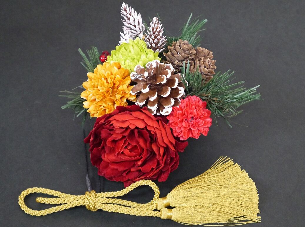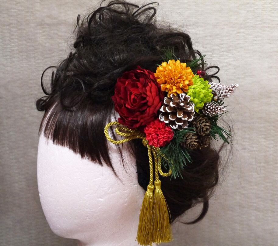 お花と松ぼっくりを合わせたレアな髪飾りです。当店オリジナル商品一点物です。