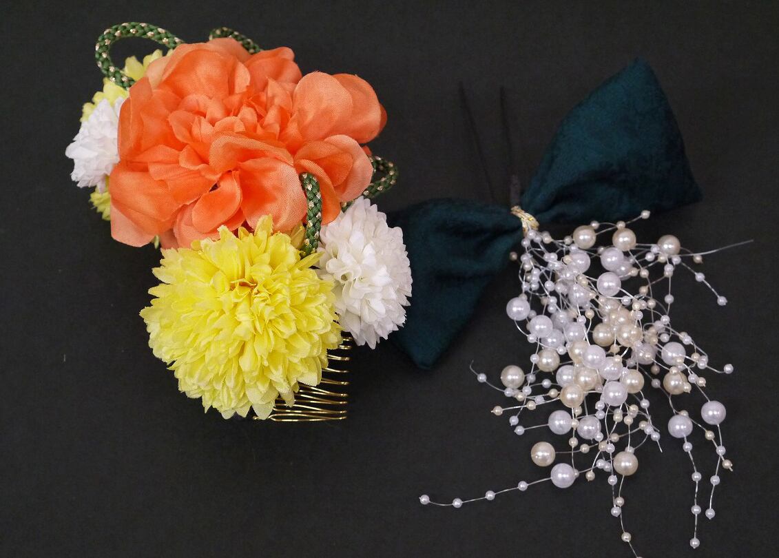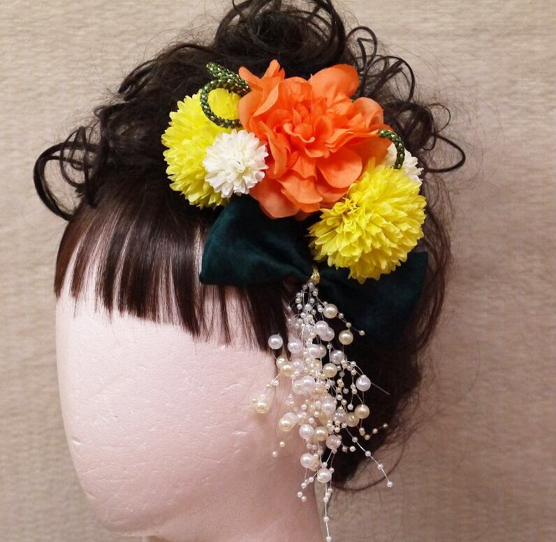 オレンジと黄色のマムとても明るくて元気なイメージの髪かざりです。当店オリジナル商品一点物です。