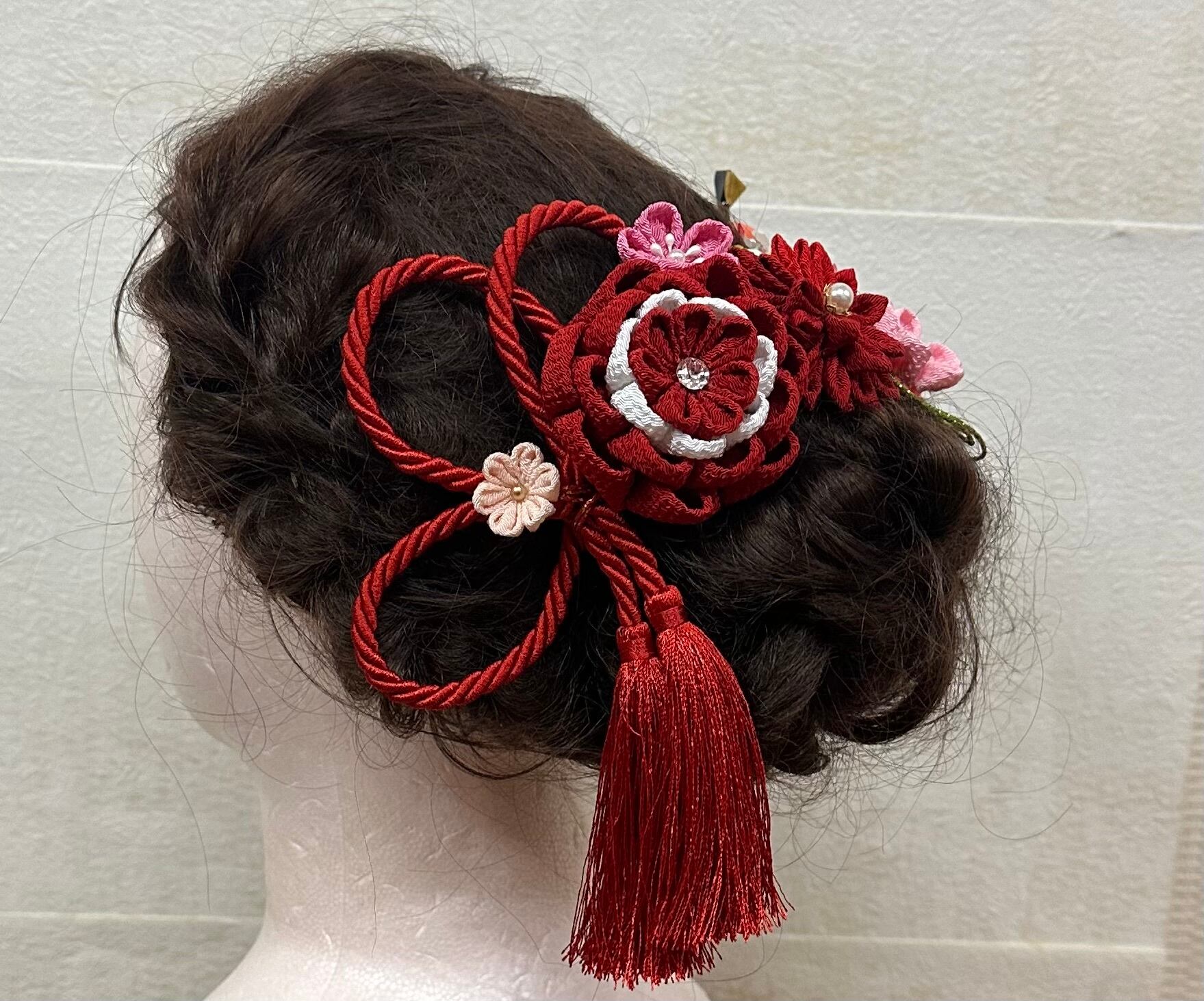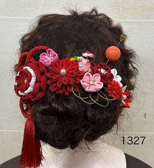 華やかさと上品さを兼ね備えた髪飾りNO.1327。手作りのつまみ細工の花や、伝統的な玉かんざし、そして優雅なタッセルが特徴です。特に人気の赤は、華やかで印象的な装いを演出します。